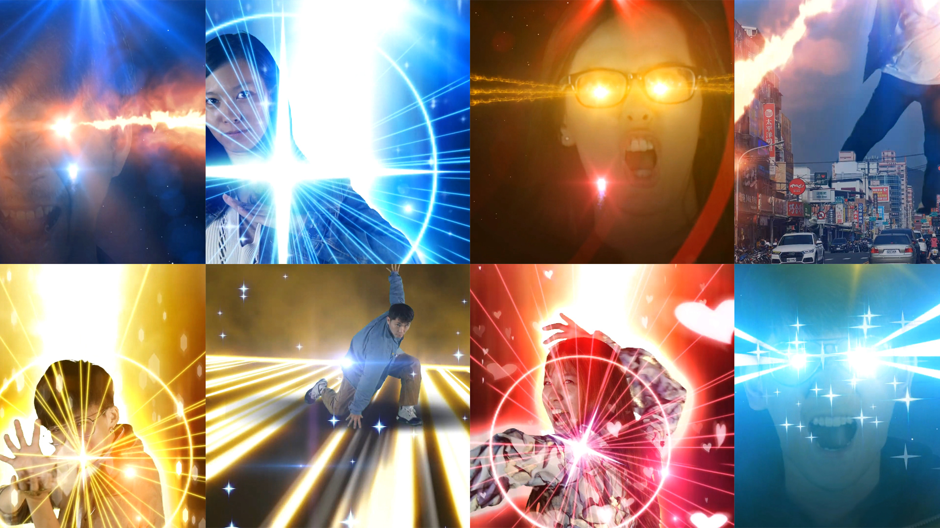 体験作品「HERO HEROINE」は、特撮やアニメの手法によって空想と現実をひとつにつなげます。体験時間は約4分。クロマキーカーテンの前で撮影する6カットによって、20秒の動画が生成されます。 撮影したポーズ・動きはリアルタイムに分析および合成されて、超越したパワーをそなえた主役として映像に登場します。