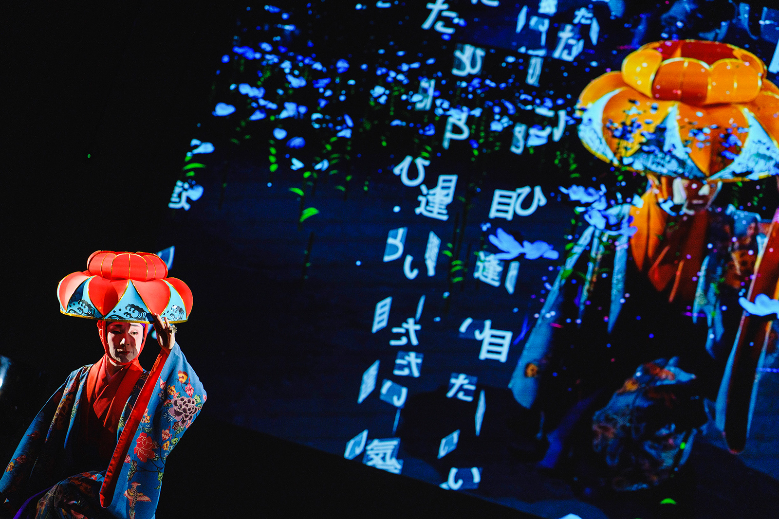 本公演は、急速に進化するデジタルテクノロジーが芸術文化や芸能にもたらす変化を探求するプロジェクトです。琉球舞踊の最高峰のひとつとされる「伊野波節(ぬふぁぶし)」を題材に、花笠を手に愛する人を慕う余情を残しながら踊る演目にAR演出を融合させました。
