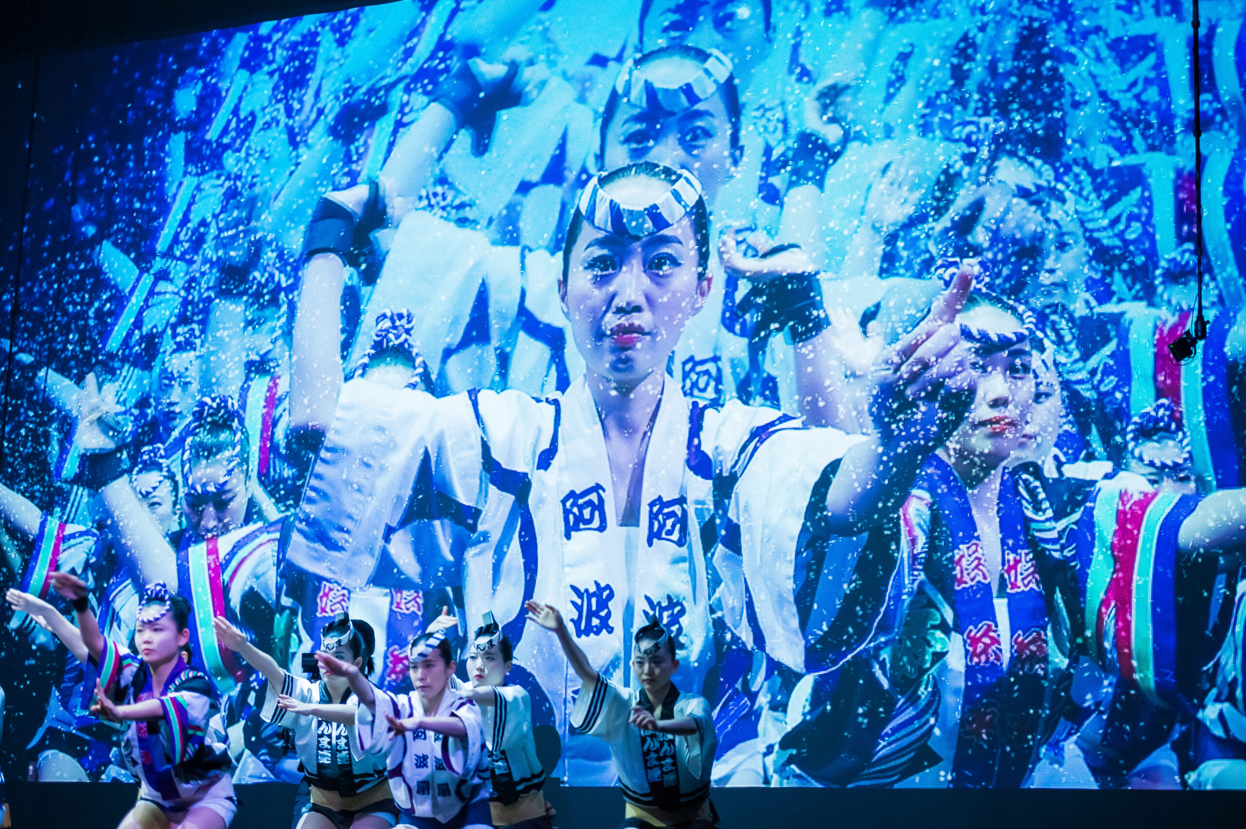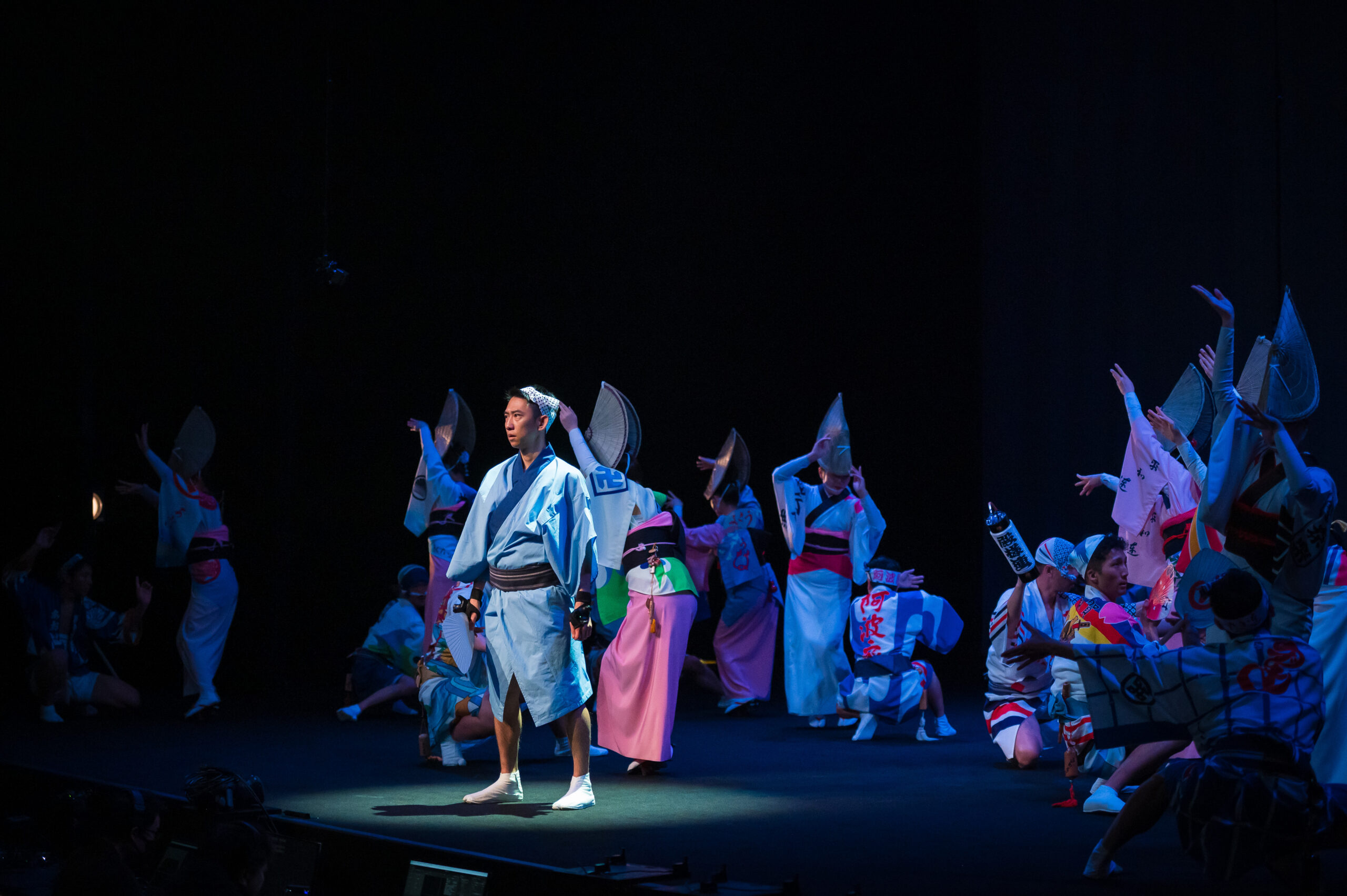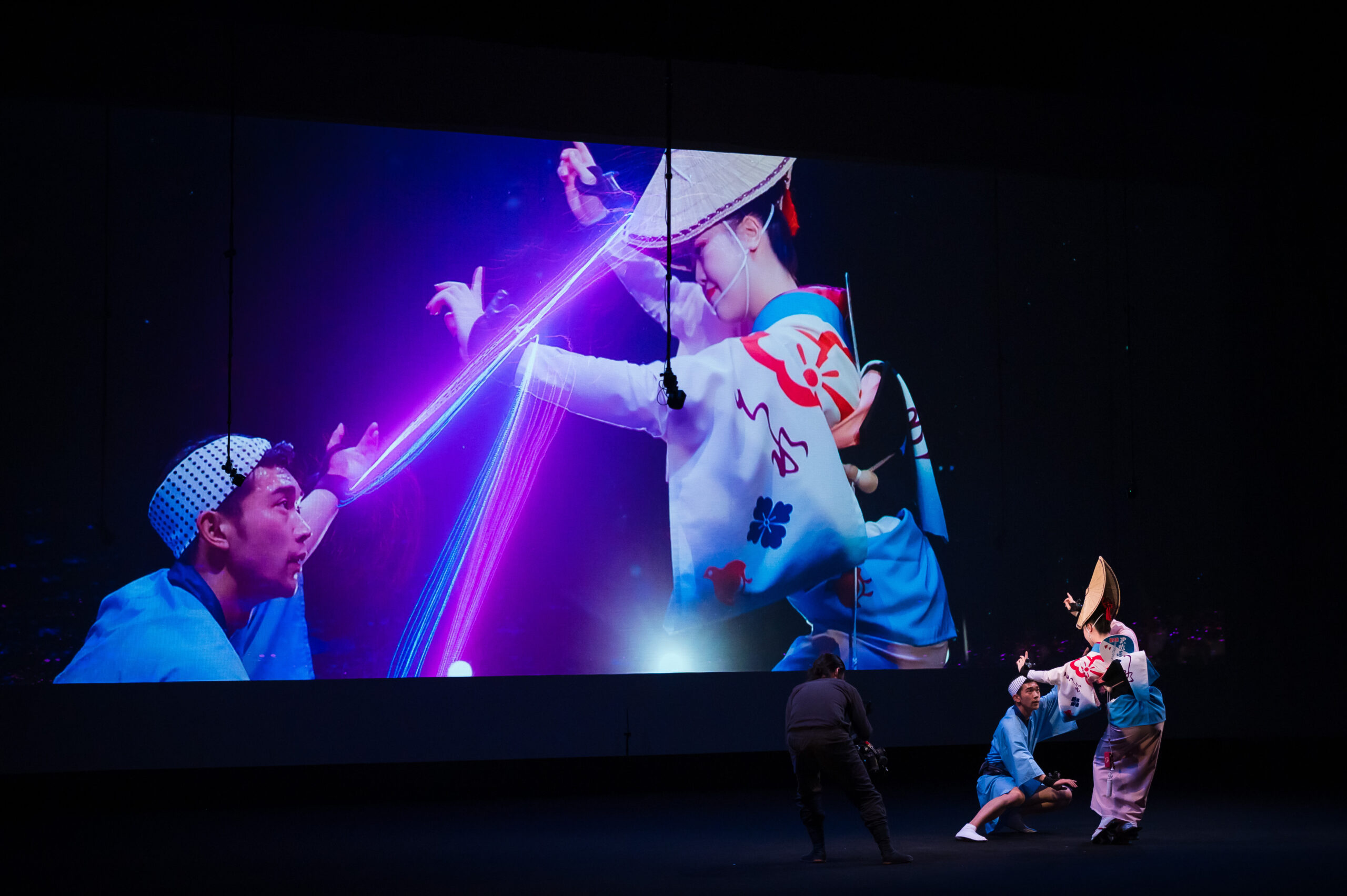 舞台は、眠りから覚めた「えべっさん」と阿波おどりに情熱を注ぐ少年の出会いからはじまります。剣山の雄大なパノラマ、轟の滝のしぶき、吉野川のうねり、鳴門の渦潮など、徳島の四季が織りなす風景がリアルタイムAR演出で舞台に広がります。総勢150名を超える阿波おどり振興協会と徳島県阿波踊り協会の精鋭たちによるダイナミックな群舞、阿波十郎兵衛座による人形浄瑠璃「えべっさん」、そして鶴澤友輔による義太夫三味線の生演奏が一体となった舞台が展開されました。
