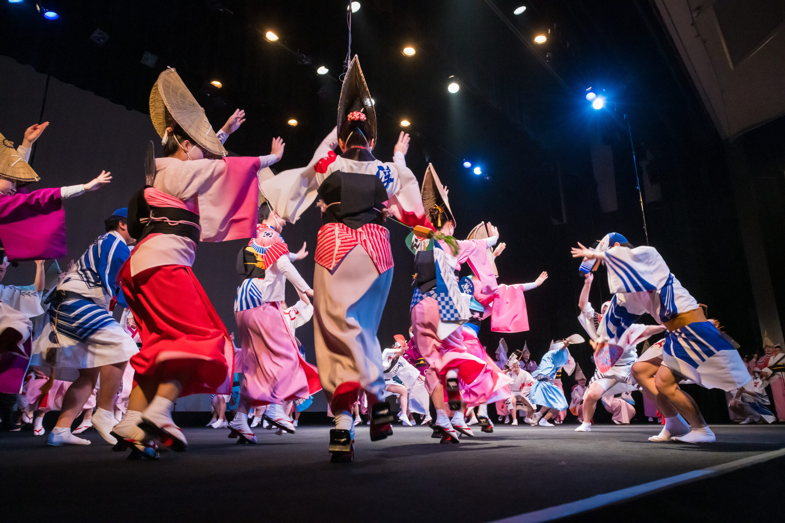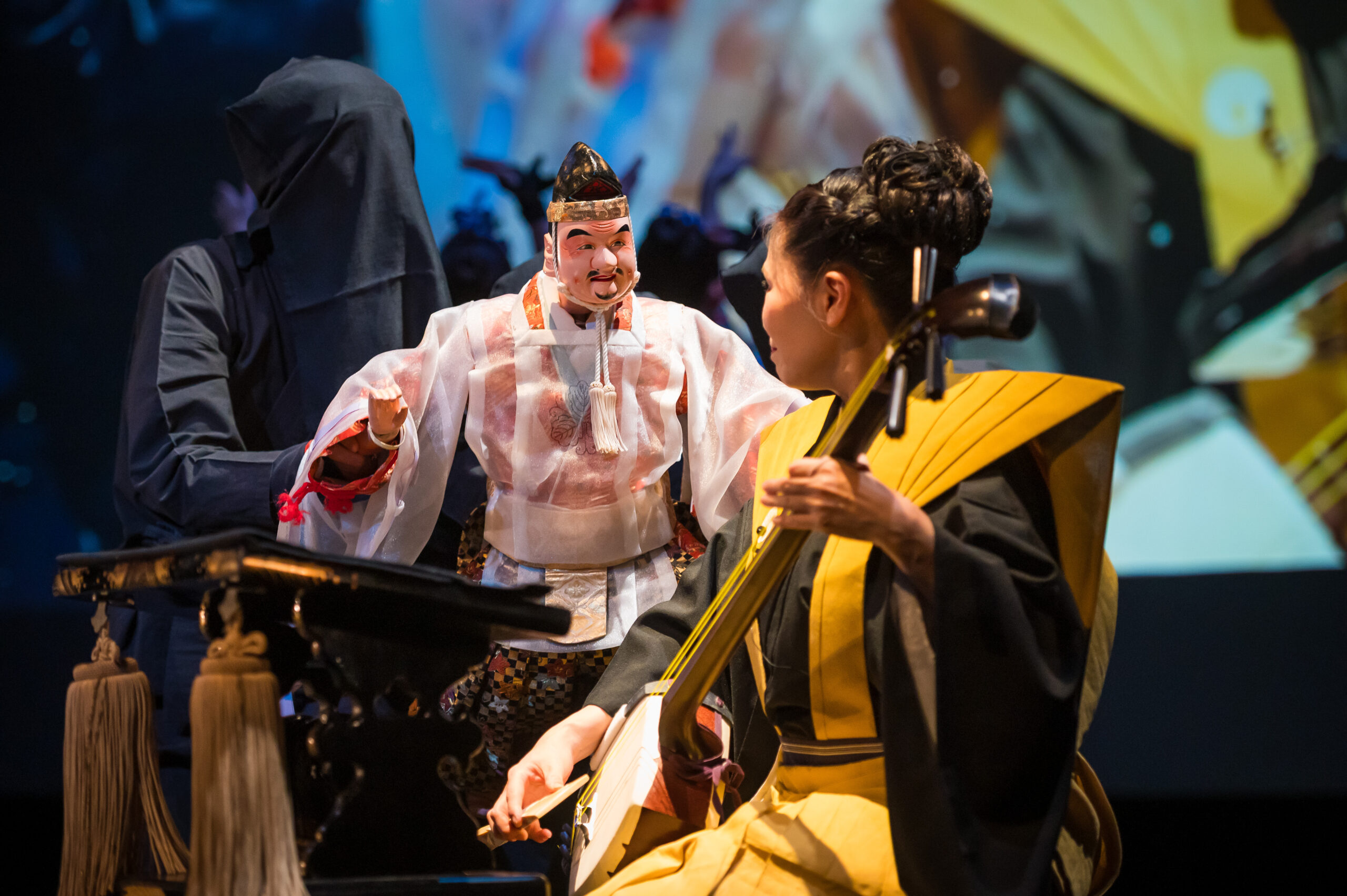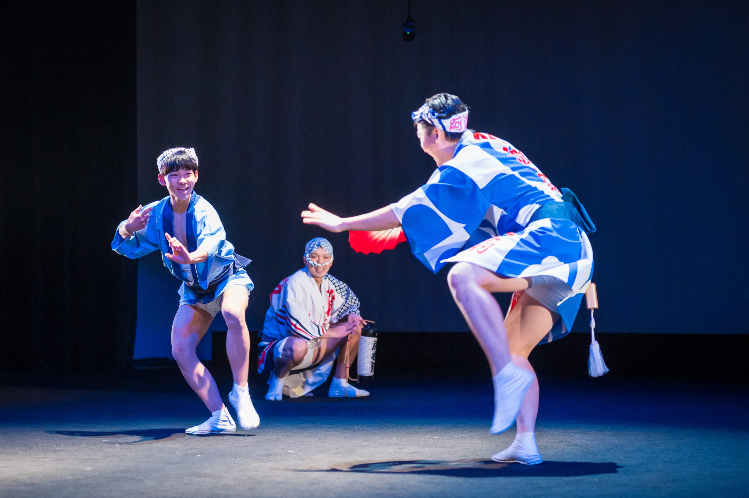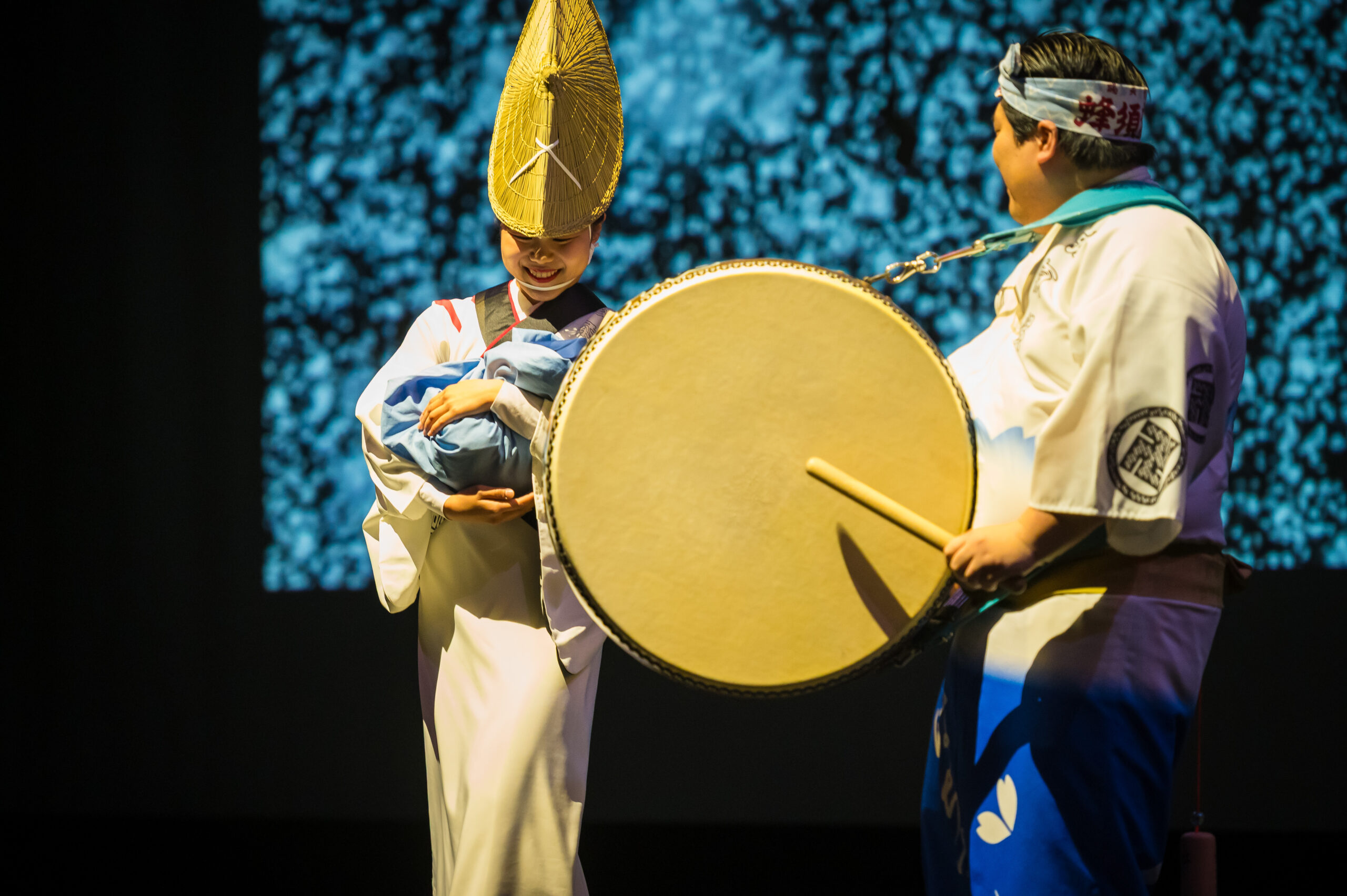 舞台は、眠りから覚めた「えべっさん」と阿波おどりに情熱を注ぐ少年の出会いからはじまります。剣山の雄大なパノラマ、轟の滝のしぶき、吉野川のうねり、鳴門の渦潮など、徳島の四季が織りなす風景がリアルタイムAR演出で舞台に広がります。総勢150名を超える阿波おどり振興協会と徳島県阿波踊り協会の精鋭たちによるダイナミックな群舞、阿波十郎兵衛座による人形浄瑠璃「えべっさん」、そして鶴澤友輔による義太夫三味線の生演奏が一体となった舞台が展開されました。